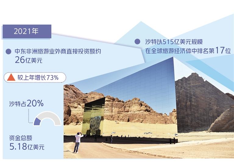 沙特将发展旅游产业作为提升非石油产业收入,实现经济多元化转型的重要途径。自2019年开放旅游签证以来,沙特旅游业迎来快速发展,数据显示,2021年中东非洲旅游业外商直接投资额达到约26亿美元,较上年度增长73%,其中沙特占20%,资金总额为5.18亿美元。根据世界旅游业理事会(WTTC)数据,沙特2021年在旅游经济体中的全球排名较新冠肺炎疫情前上升了两位,以515亿美元的规模排名第17位。