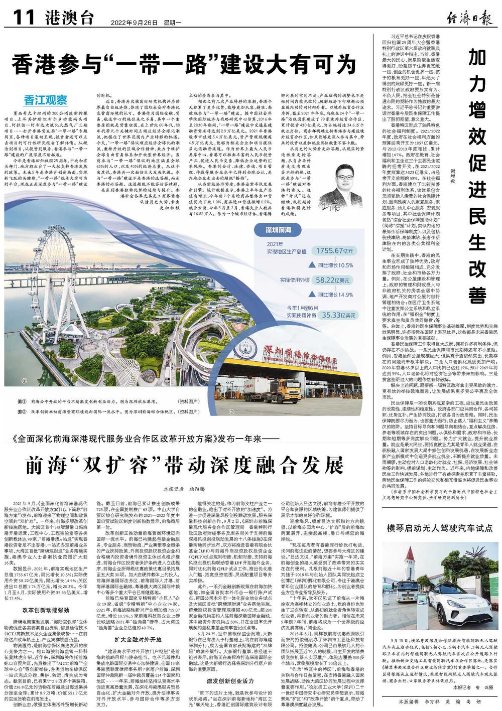 2021年9月,《全面深化前海深港现代服务业合作区改革开放方案》(以下简称“前海方案”)发布,前海迎来了物理空间和政策空间的“双扩容”。一年来,前海多项改革创新措施落地。大湾区首个5G智慧港口妈湾港开港运营,工程中心、工程实验室等各类创新载体达98家,“前海港澳e站通”实现香港投资者足不出香港、一站式办理前海业务事项,大湾区首批“跨境理财通”业务落地实施,港澳专业人士备案执业范围扩大到16类。