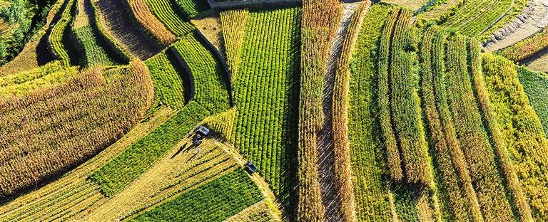 9月25日,在河北省迁安市五重安镇大何庄村南,层层叠叠的梯田呈现斑斓色彩。这里曾经是废弃的排土场、大矿坑,当地投资276万余元,进行系统生态修复治理,仅用一年时间,新增4.9公顷肥沃良田。