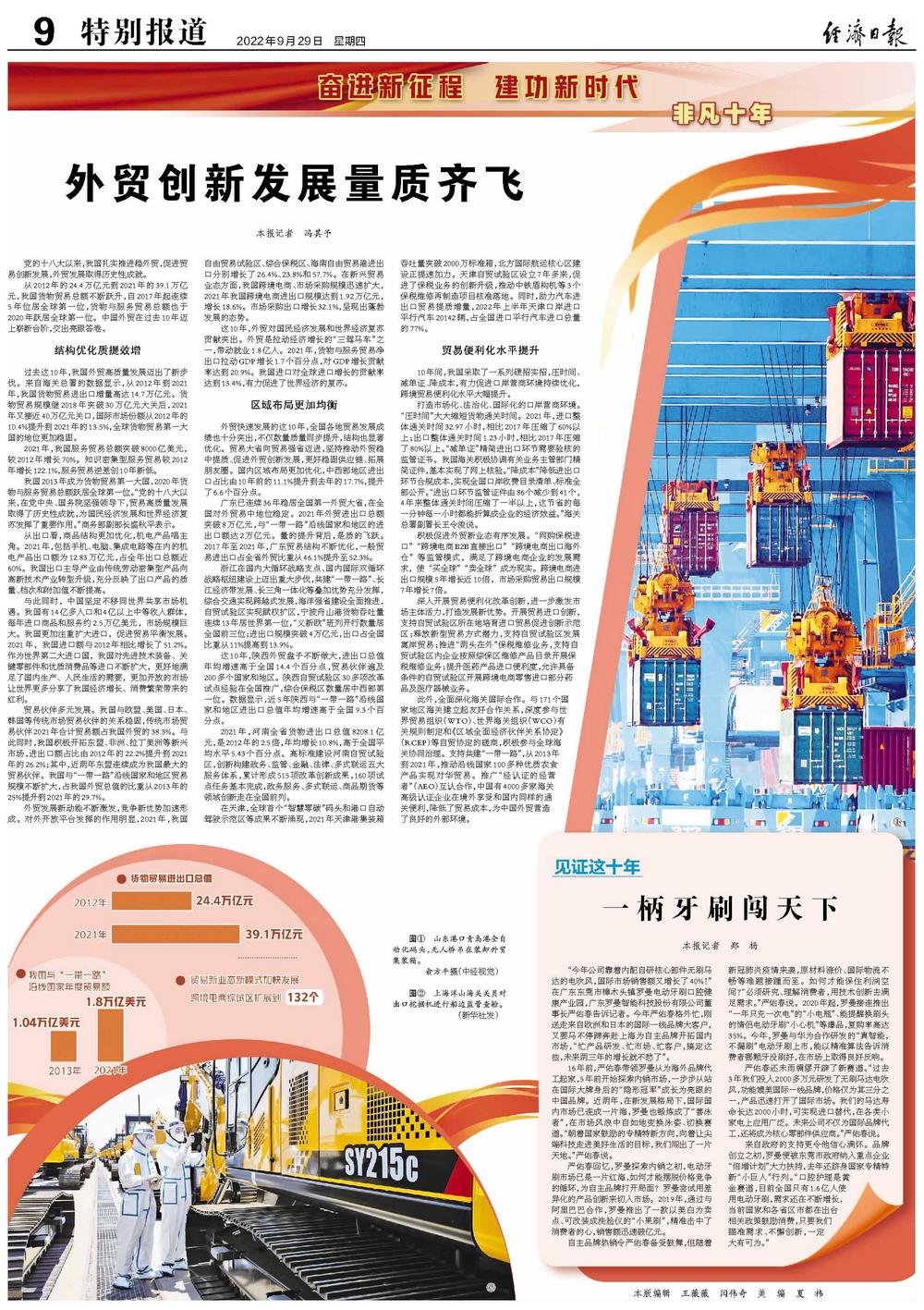 外贸快速发展的这10年,全国各地贸易发展成绩也十分突出,不仅数量质量同步提升,结构也显著优化。贸易大省向贸易强省迈进,坚持推动外贸稳中提质、促进外贸创新发展,更好稳固供应链、拓展朋友圈。国内区域布局更加优化,中西部地区进出口占比由10年前的11.1%提升到去年的17.7%,提升了6.6个百分点。