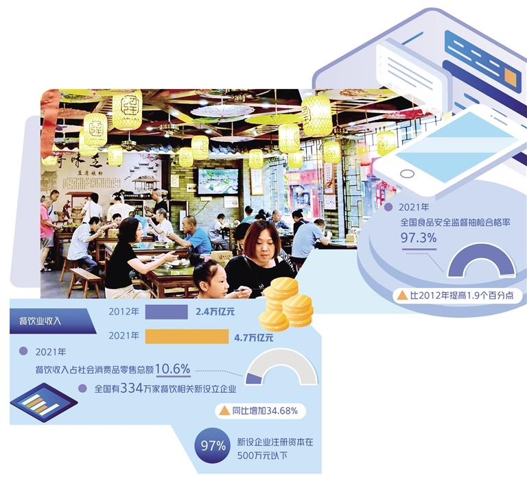 党的十八大以来,我国餐饮业收入从2012年的2.4万亿元增长到2021年的4.7万亿元,增长近1倍。其中,除2020年受疫情影响发展迟滞外,每年均呈现阶梯式增长。2021年,全国餐饮业收入占社会消费品零售总额的10.6%,且从2015年开始(除2020年),每年全国餐饮业收入增幅均大于社会消费品零售总额增幅。不难看出,餐饮业持续发挥了促进经济增长、带动消费提升的重要驱动作用。