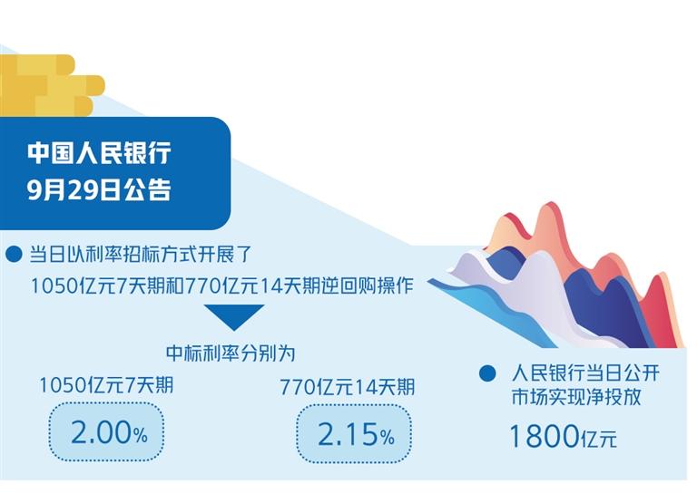 季末节前,公开市场操作力度明显加大。中国人民银行9月29日公告称,为维护季末流动性平稳,当日人民银行以利率招标方式开展了1050亿元7天期和770亿元14天期逆回购操作,中标利率分别为2.00%、2.15%。由于29日有20亿元逆回购到期,人民银行当日公开市场实现净投放1800亿元。