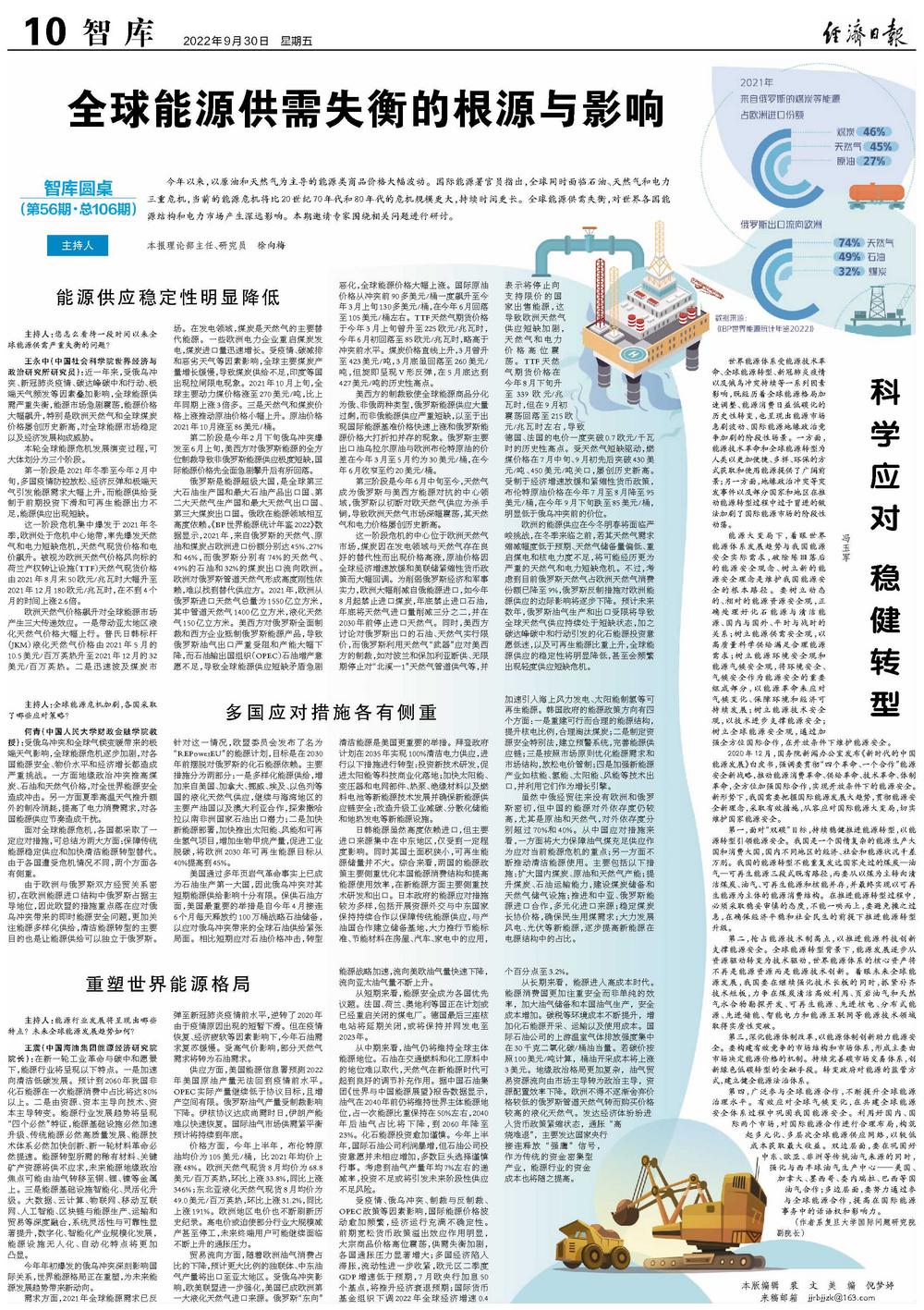 王永中(中国社会科学院世界经济与政治研究所研究员):近一年来,受俄乌冲突、新冠肺炎疫情、碳达峰碳中和行动、极端天气频发等因素叠加影响,全球能源供需严重失衡,能源市场急剧震荡,能源价格大幅飙升,特别是欧洲天然气和全球煤炭价格屡创历史新高,对全球能源市场稳定以及经济发展构成威胁。