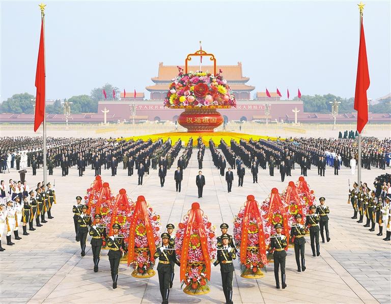 壮阔的天安门广场上,鲜艳的五星红旗高高飘扬,人民英雄纪念碑巍然耸立。广场中央,“祝福祖国”巨型花篮表达着对国家繁荣富强的美好祝愿,花篮上“喜迎二十大”的字样传递着全党全军全国各族人民对党的二十大胜利召开的热切期盼。