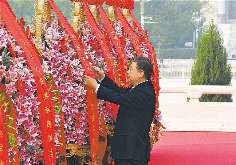 习近平迈步上前,仔细整理花篮缎带。随后,习近平等党和国家领导人缓步绕行,瞻仰人民英雄纪念碑。