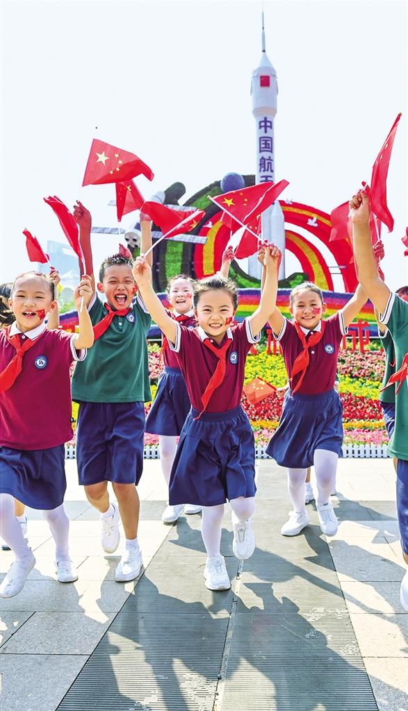 十月一日,江西南昌市广南学校的孩子们挥舞国旗,欢度国庆。国庆假期,南昌市八一广场红旗招展、鲜花点缀,处处洋溢着欢乐祥和的节日氛围。陈 莉摄(中经视觉)
