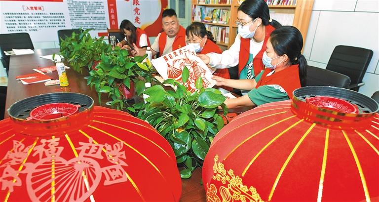 ▶山东省阳谷县侨润街道秦海村党支部组织党员开展“喜迎二十大,欢度国庆”主题活动,党员志愿者用一幅幅剪纸作品表达美好心愿。宋延安摄(中经视觉)