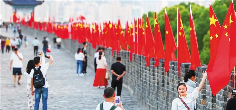 ◀湖北省襄阳市古城墙上悬挂起鲜艳的五星红旗,为国庆佳节增添了一道亮丽的风景。