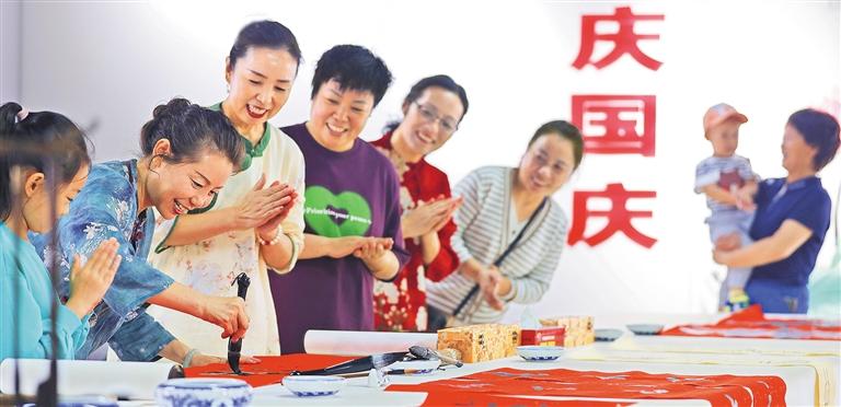 ▼河北省保定市西高社区居民挥毫泼墨,用书法的形式表达对祖国的美好祝愿。