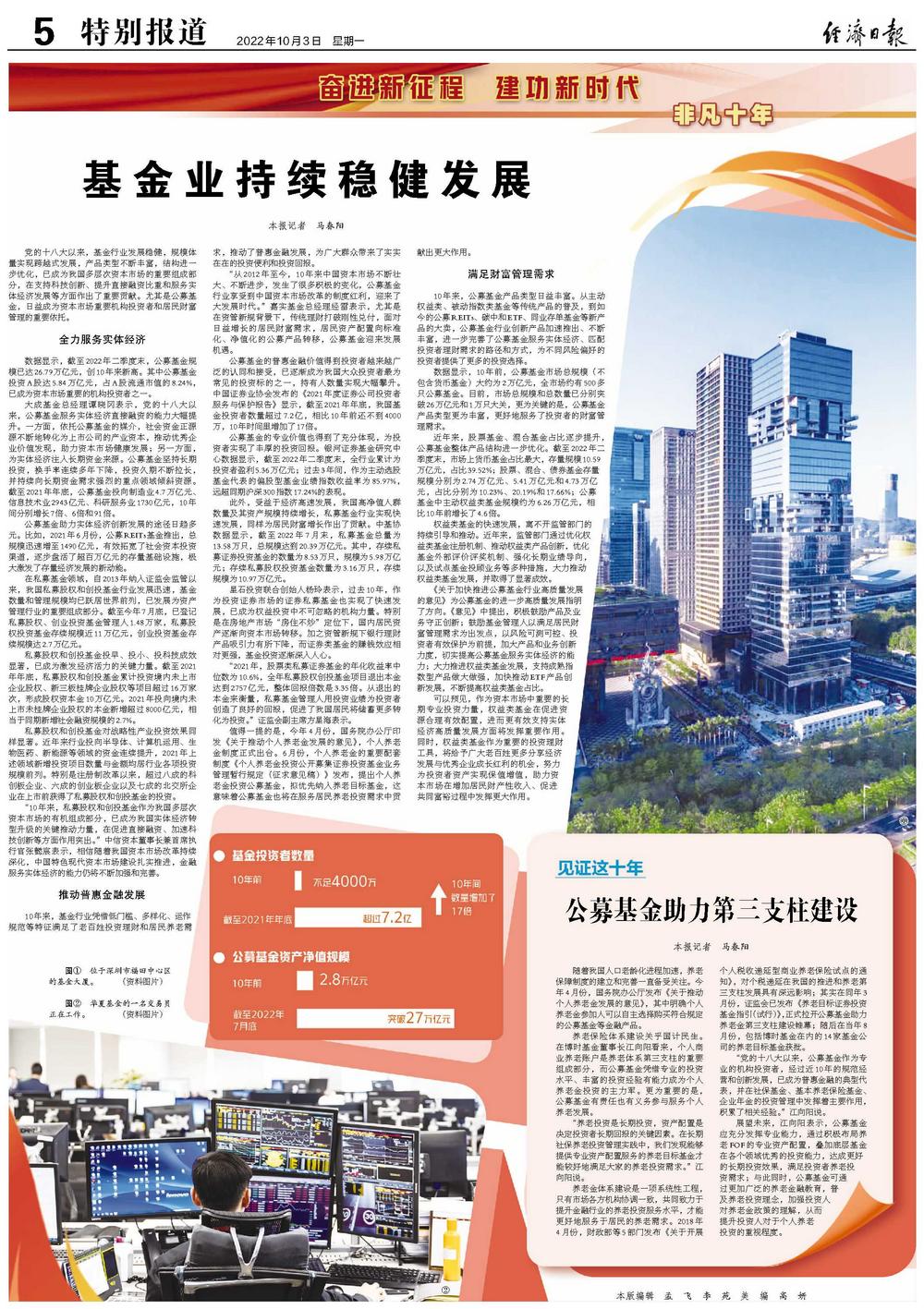 10年来,基金行业凭借低门槛、多样化、运作规范等特征满足了老百姓投资理财和居民养老需求,推动了普惠金融发展,为广大群众带来了实实在在的投资便利和投资回报。