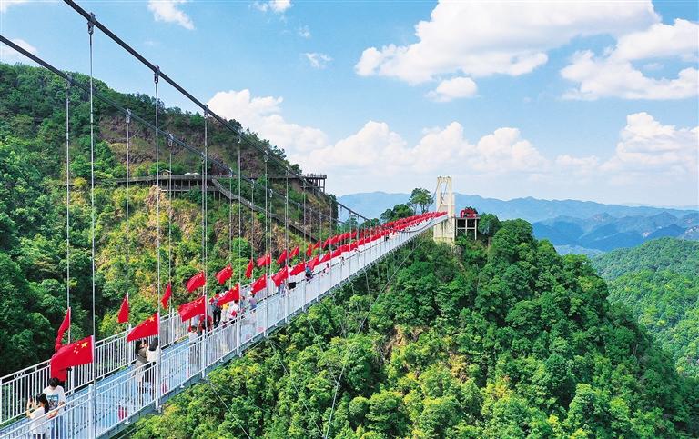 10月4日,江西省安远县三百山景区玻璃天桥上五星红旗迎风飘扬,游客拍照留念。国庆假期,当地景区多举措营造节日氛围,综合提升“颜值”,吸引大批游客打卡。魏迪金摄(中经视觉)