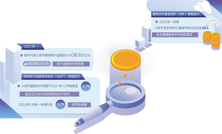 不断创新高的还有人民币的储备货币功能。国际货币基金组织(IMF)发布的官方外汇储备货币构成(COFER)数据显示,2022年一季度,人民币在全球外汇储备中的占比达2.88%,较2016年人民币刚加入特别提款权(SDR)货币篮子时上升1.8个百分点,在主要储备货币中排名第五位。据不完全统计,有80多个境外央行或货币当局将人民币纳入外汇储备。