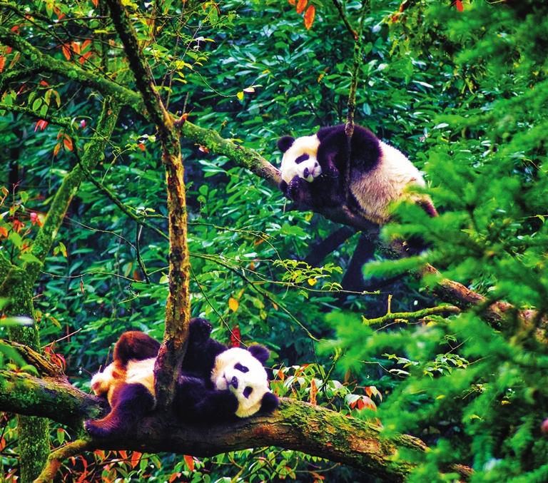 ▼雅安碧峰峡大熊猫中心,大熊猫在树上悠闲惬意。雅安是大熊猫的科学发现地,全市39.45%的幅员面积纳入大熊猫国家公园范围。曹省利摄(中经视觉)