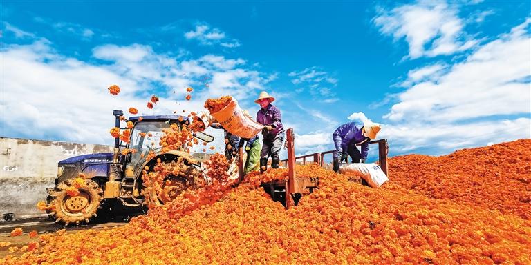 ▶凉山彝族自治州盐源县农民在收获万寿菊。该县立足资源优势,积极发展特色产业,助民增收。