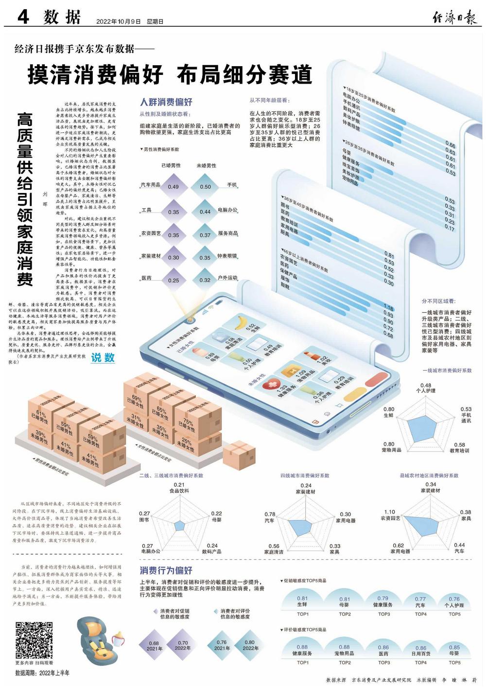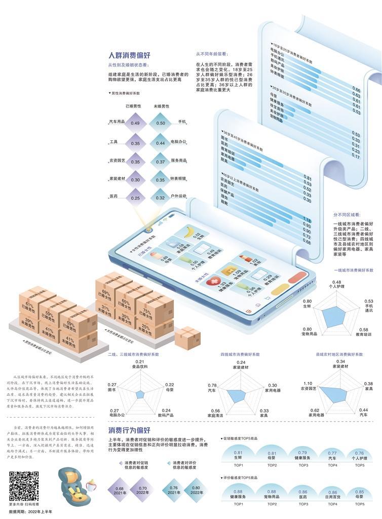 消费者行为日趋理性,对产品和服务的性价比提出了更高要求。数据显示,消费者在家庭消费中,对促销和评价更为敏感。其中,消费者对消费频次较高、可以日常囤货的生鲜、母婴、清洁等商品有更高的促销敏感度,相关企业可以在这些领域积极开展促销活动,吸引客流。而在运动健康、本地生活等服务消费领域,消费者对用户评价的敏感度更高,相关商家要加快提高服务质量与用户体验,积累正向口碑。