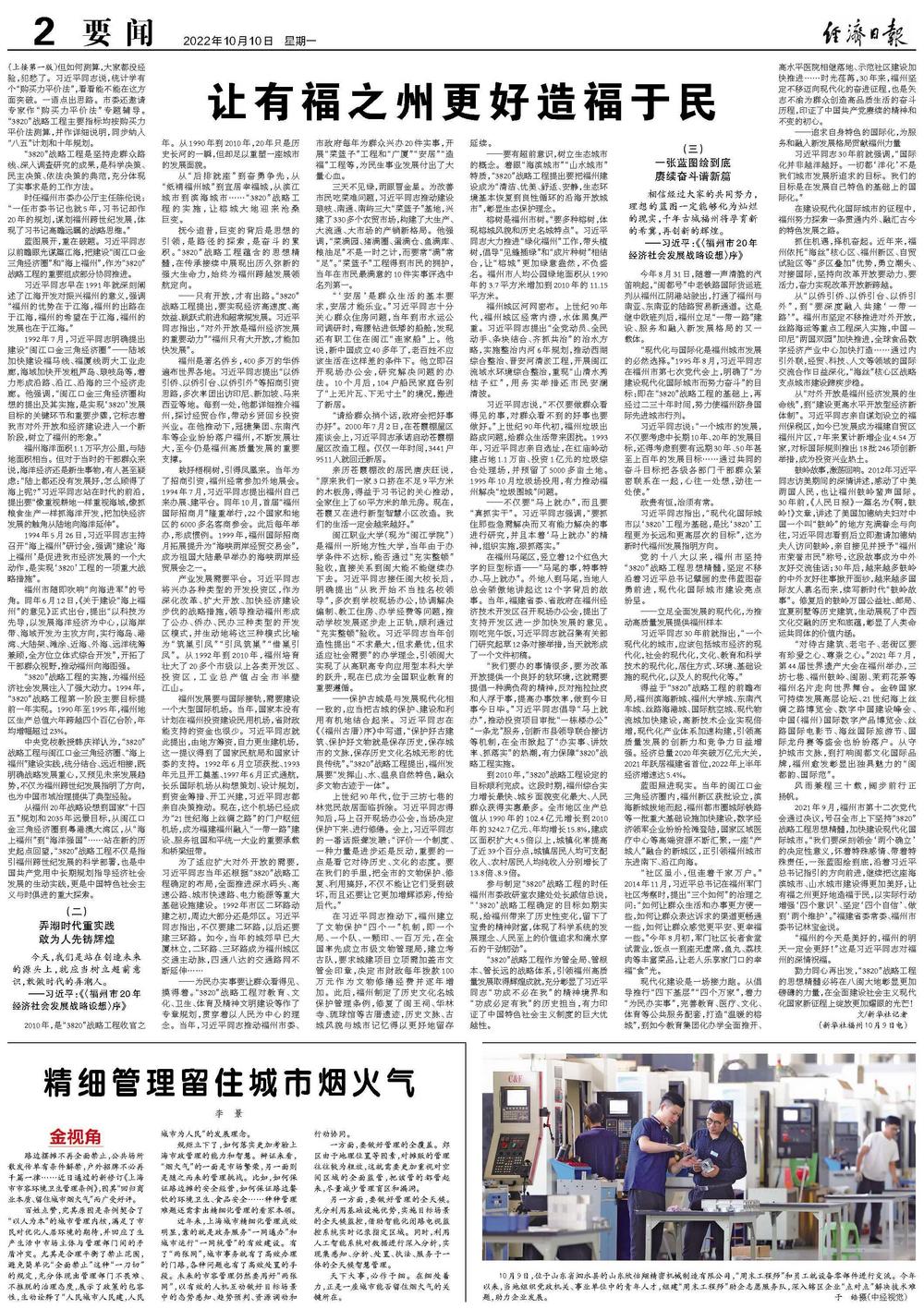 从福州20年战略设想到国家“十四五”规划和2035年远景目标,从闽江口金三角经济圈到粤港澳大湾区,从“海上福州”到“海洋强国”……站在新的历史起点回望,“3820”战略工程不仅是指引福州跨世纪发展的科学部署,也是中国共产党用中长期规划指导经济社会发展的生动实践,更是中国特色社会主义与时俱进的重大探索。