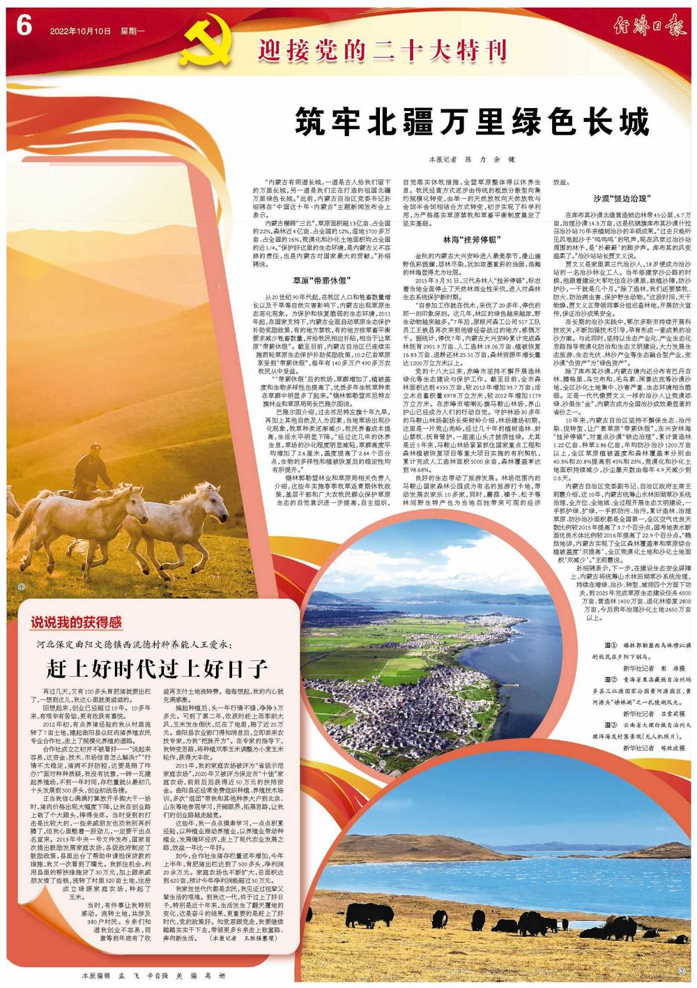 内蒙古自治区党委副书记、自治区政府主席王莉霞介绍,这10年,内蒙古统筹山水林田湖草沙系统治理,全方位、全地域、全过程开展生态文明建设,一手抓护绿、扩绿,一手抓防污、治污,累计造林、治理草原、防沙治沙面积都是全国第一,全区空气优良天数比例较2015年提高了3.7个百分点,国考地表水断面优良水体比例较2016年提高了22.9个百分点。“概括地讲,内蒙古实现了全区森林覆盖率和草原综合植被盖度‘双提高’,全区荒漠化土地和沙化土地面积‘双减少’。”王莉霞说。
