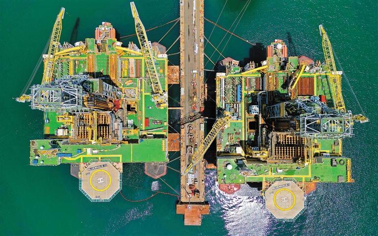 ▼中集来福士山东烟台建造基地,正在维护中的“蓝鲸1号”和“蓝鲸2号”钻井平台。“蓝鲸”系列是目前全球最先进的钻井平台,标志着我国海工装备在自主创新的道路上取得长足发展。
