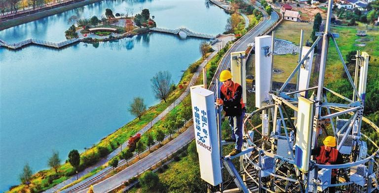 ▶安徽省铜陵市义安区凤凰山村,工作人员在安装5G基站。在经历3G追赶、4G并驾齐驱后,我国移动通信行业在5G领域已发展成为“领头羊”。高凌君摄(中经视觉)
