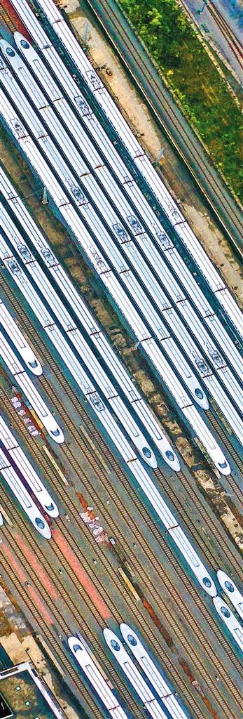 ◀中国铁路南昌局集团有限公司南昌车辆段,整齐排列的动车组列车蓄势待发。中国高铁从无到有,不断通过自主创新实现自我超越、快速发展。鲍赣生摄(中经视觉)