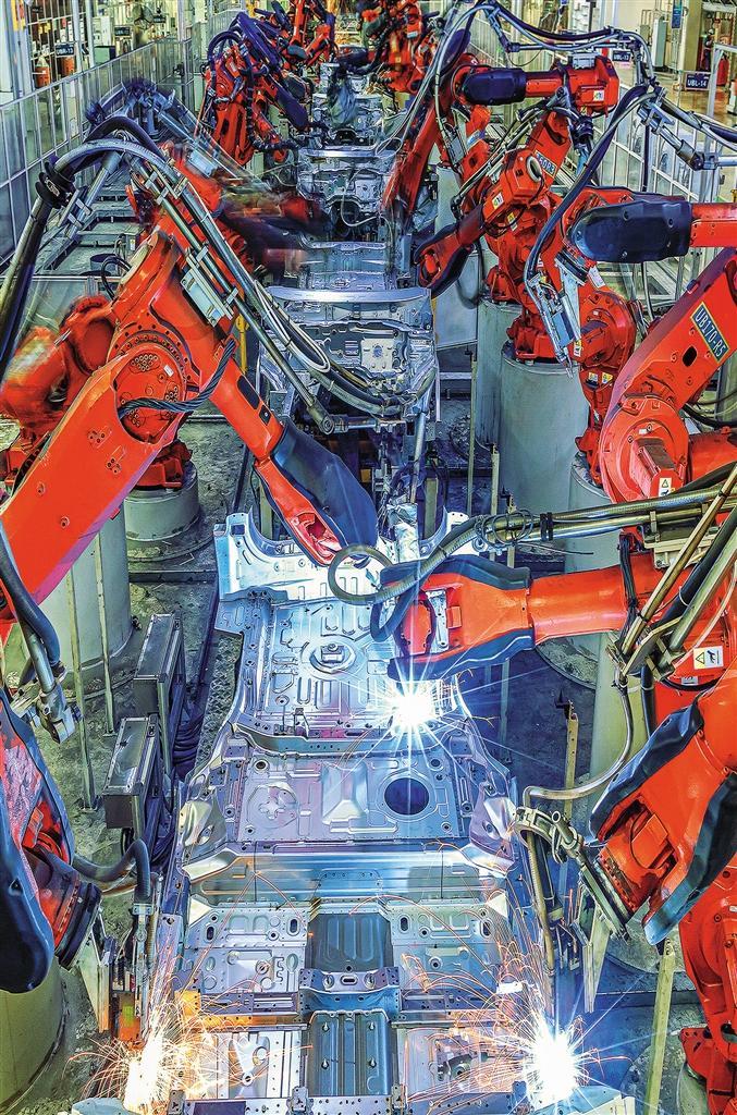 ▶河北省保定市长城汽车股份有限公司焊装车间,机器人在进行焊接作业。长城汽车自主研发的技术填补了中国高阶动力总成领域的空白,助力中国汽车品牌迈向高端化。
