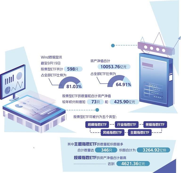 2004年,华夏基金推出了境内首只ETF产品——华夏上证50ETF,自此我国公募基金开始加速布局ETF产品。Wind数据显示,截至9月19日,股票型ETF共计598只,占全部ETF比例为81.03%。资产净值合计10053.76亿元,占全部ETF比例为64.91%,股票型ETF的数量和合计资产净值较年初分别增加73只和425.90亿元。