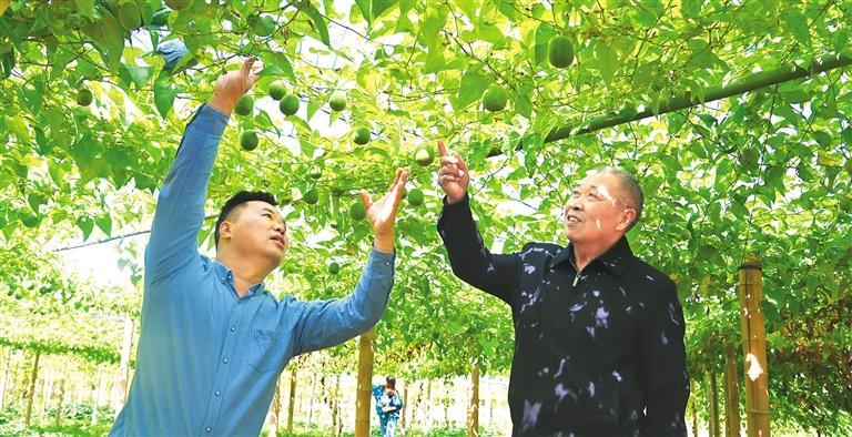 江西省宜春市袁州区竹亭镇社江村,村民曹全焕(左)在罗汉果基地观察果子长势。曹全焕在浙江杭州创业10多年后返乡,投资开办了种植基地、养殖场,带动村民一起增收致富。
