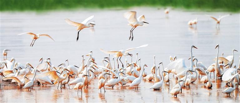 白鹭在山西省运城市平陆县黄河湿地翩翩起舞。当地良好的生态环境使来此繁衍的珍稀鸟类种类和数量不断增加。闫 鑫摄(中经视觉)
