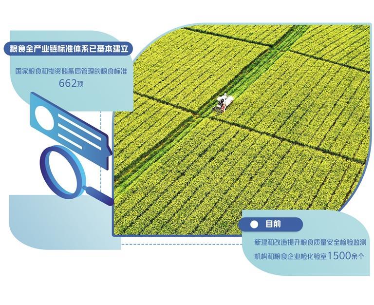 粮食标准化是保障国家粮食安全的基础性工作。近年来,我国加强粮食质量标准工作,提高粮食质量安全水平,取得明显成效。如组织修订了《小麦》《玉米》《大豆》等强制性国家标准;推动发布了《大米》《小麦粉》《菜籽油》等涉及百姓切身利益的重点国家标准;强化源头把关,初步建立了粮油质量安全快检方法行业标准体系。目前,国家粮食和物资储备局管理的粮食标准662项,粮食全产业链标准体系已基本建立。“我国粮油产品质量安全检验方法标准与国际标准已基本一致,为保障国家粮食质量安全提供了重要技术支撑。”国家粮食和物资储备局标准质量中心负责人说。