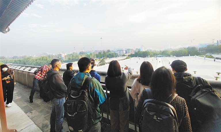 10月12日,党的二十大新闻中心组织80余名境内外媒体记者沿北京中轴线举行“揽胜中轴气象 品韵古都风华”主题采访活动。活动中,记者们走访了钟鼓楼及“时间的故事”展览、前门三里河公园等。图为讲解员介绍北京历史变迁。本报记者 童云斐摄