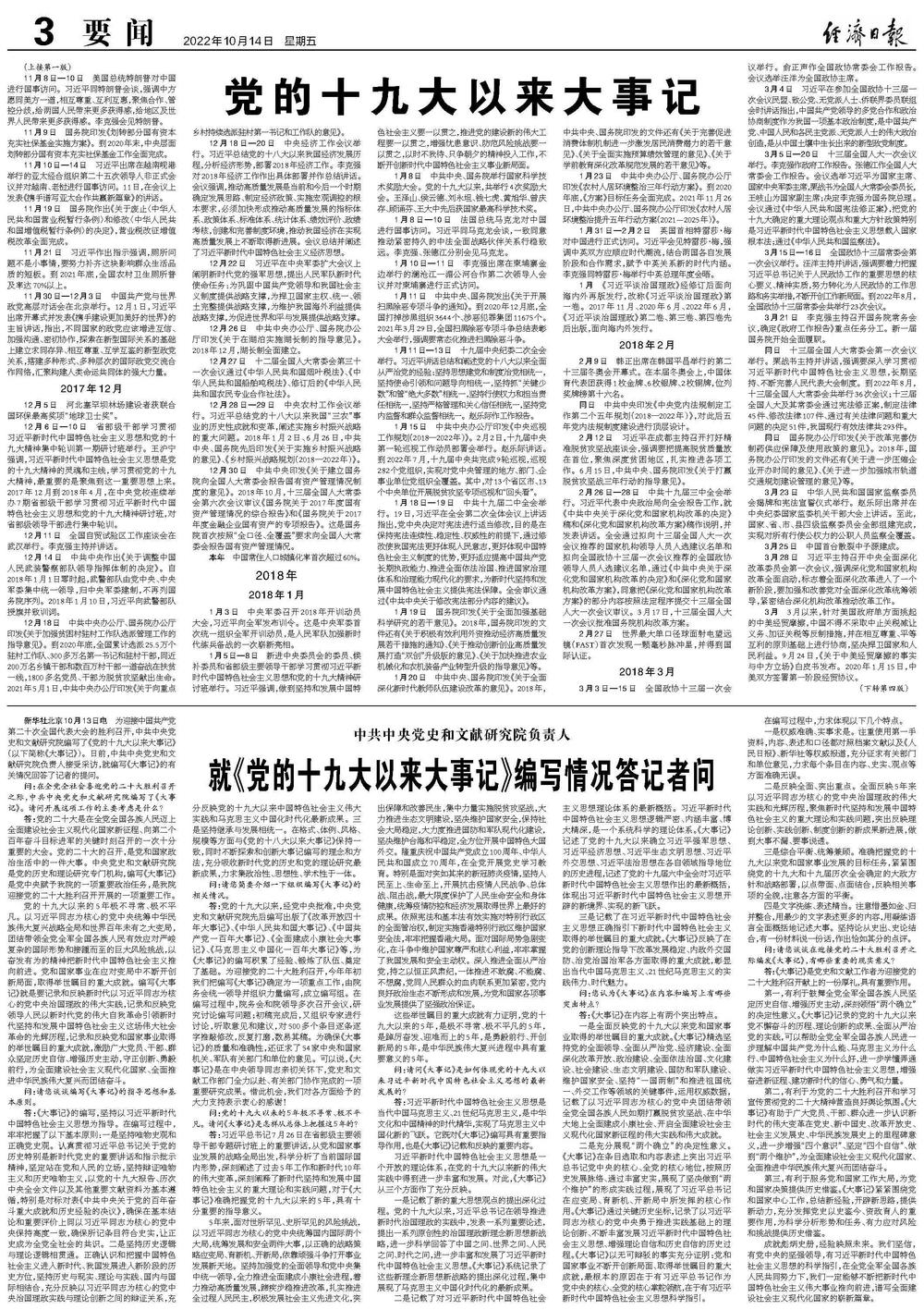 编者按 为迎接中国共产党第二十次全国代表大会胜利召开,中共中央党史和文献研究院编写了《党的十九大以来大事记》。党的十九大以来,以习近平同志为核心的党中央统筹中华民族伟大复兴战略全局和世界百年未有之大变局,团结带领全党全军全国各族人民有效应对严峻复杂的国际形势和接踵而至的巨大风险挑战,采取一系列战略性举措,推进一系列变革性实践,实现一系列突破性进展,取得一系列标志性成果,攻克了许多长期没有解决的难题,办成了许多事关长远的大事要事,以奋发有为的精神把新时代中国特色社会主义推向前进。《大事记》集中反映了5年来党和国家事业取得举世瞩目的重大成就。