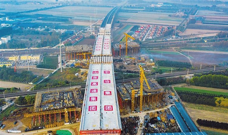 10月13日,由山东高速集团投资建设的潍坊至青岛公路及连接线工程(潍青项目)跨胶济客运专线、胶济铁路两个T型连续刚构转体桥完成空中精准对接,为年底前济青高速中线建成通车奠定坚实基础。张明博摄(中经视觉)