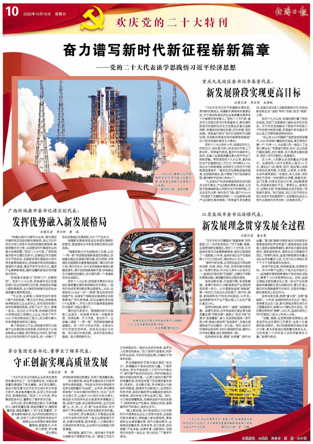 “习近平总书记关于把握新发展阶段、贯彻新发展理念、构建新发展格局的重要论述,对于推动我国经济社会高质量发展具有十分重要的指导意义。”党的二十大代表、重庆市九龙坡区委书记李春奎表示,新发展阶段是对我国所处历史方位做出的重大战略判断,有着深刻的理论依据、历史依据、现实依据。李春奎代表对“我们已经拥有开启新征程、实现新的更高目标的雄厚物质基础”这个现实依据的感受尤为真切。