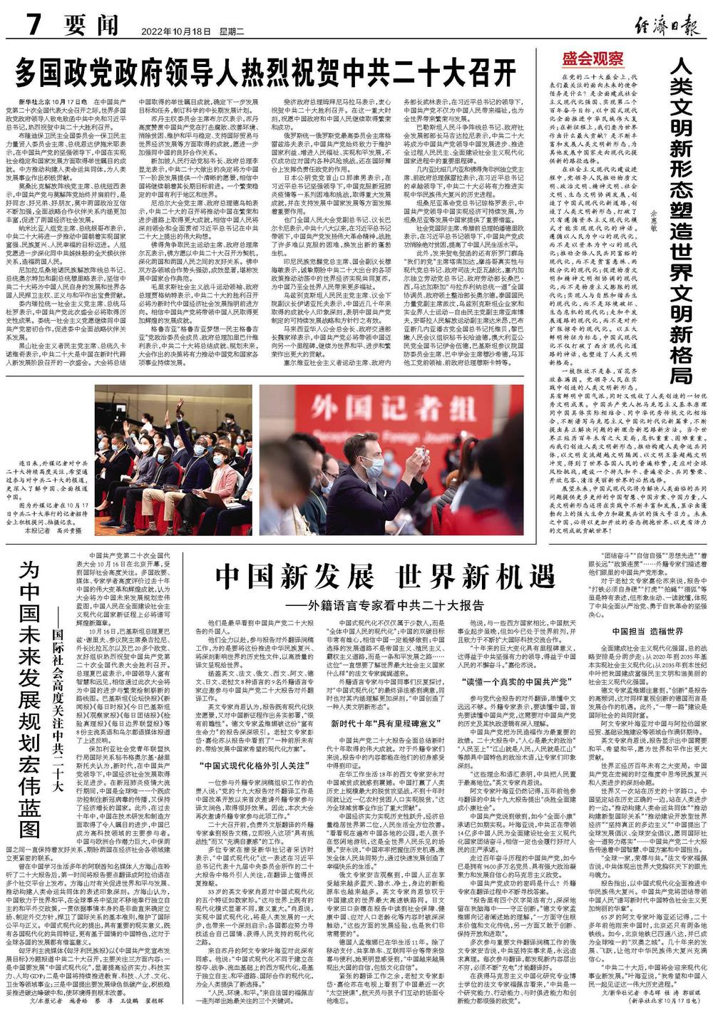 中国共产党第二十次全国代表大会10月16日在北京开幕,受到国际社会高度关注。多国政要、媒体、专家学者高度评价过去十年中国的伟大变革和辉煌成就,认为大会将为中国未来发展规划宏伟蓝图,中国人民在全面建设社会主义现代化国家新征程上必将谱写辉煌新篇章。