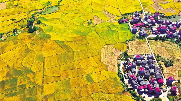 10月18日,在江西省永丰县潭城乡白水门水库灌区拍摄的水稻田,当地晚稻大面积成熟,迎来收获。目前,全国秋粮已收获10.46亿亩,超过八成,丰收在望,谷物总产量稳居世界第一的大国粮仓根基不断夯实。刘浩军摄(中经视觉)