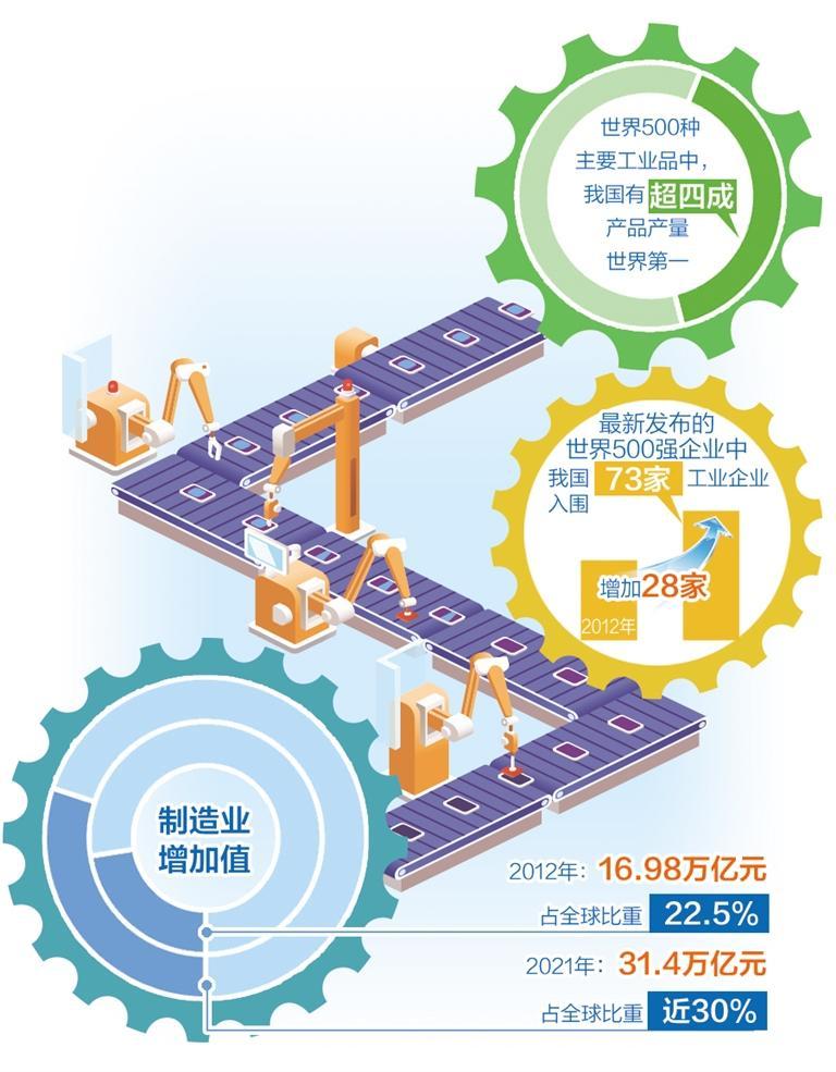 依托我国超大规模的市场优势和世界最大规模的中等收入群体,我国制造业的规模优势不断巩固。制造业增加值从2012年的16.98万亿元增加到2021年的31.4万亿元,占全球比重从22.5%提高到近30%,连续12年保持世界第一制造大国地位。在世界500种主要工业品中,我国有超过四成产品的产量位居世界第一。强大国内市场加快形成,还为我国制造业从规模经济向基于大规模定制的范围经济优势和规模经济优势“双重优势”叠加转变提供条件。同时,全球产业门类最齐全、产业体系最完整、产业链配套能力全球领先等,让中国制造业具备了大而全的优势,具有强大韧性和发展潜力,能迅速构筑起“防波堤”,这在我国应对新冠肺炎疫情等冲击过程中已得到充分彰显。