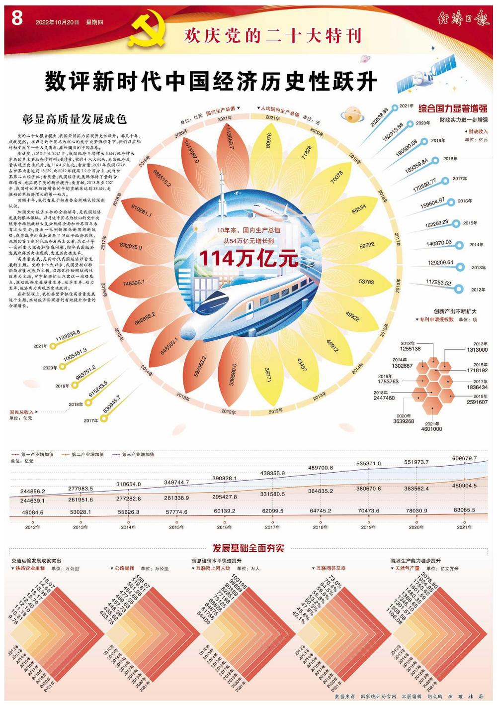 党的二十大报告提出,我国经济实力实现历史性跃升。非凡十年,成就斐然。在以习近平同志为核心的党中央坚强领导下,我们以实际行动交出了一份人民满意、举世瞩目的中国答卷。