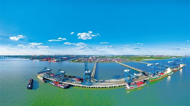 10月18日,江苏南通港通海港区集装箱作业区码头一片忙碌。通海港区是当地重点打造的现代化集装箱港区和江海联运枢纽港,投产运营以来,集装箱吞吐量逐年增加。