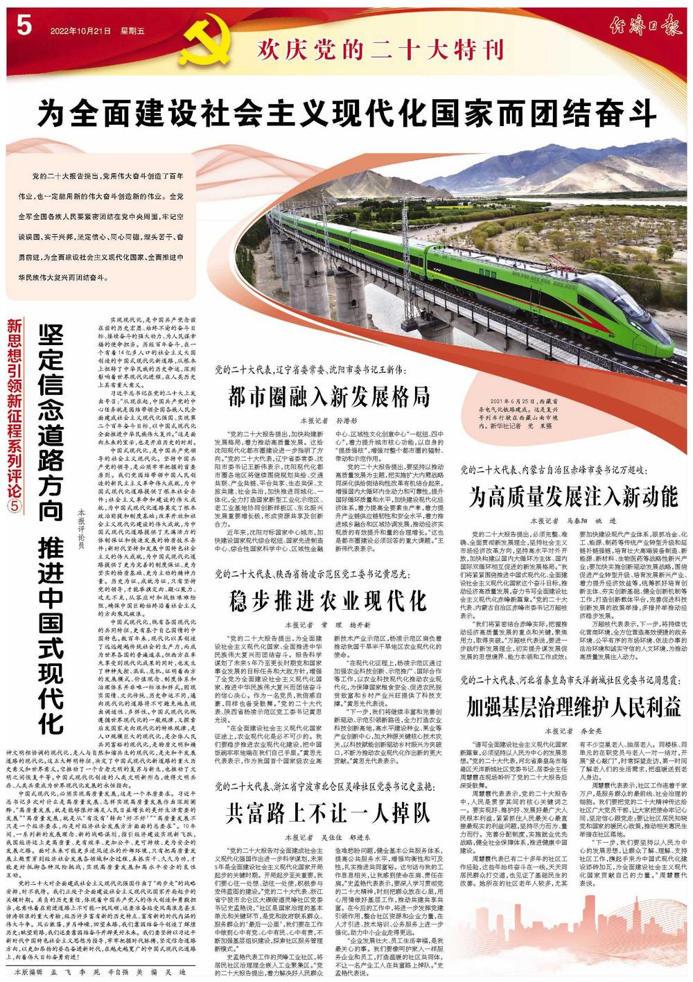 “党的二十大报告提出,为全面建设社会主义现代化国家、全面推进中华民族伟大复兴而团结奋斗。报告科学谋划了未来5年乃至更长时期党和国家事业发展的目标任务和大政方针,增强了全党为全面建设社会主义现代化国家、推进中华民族伟大复兴而团结奋斗的信心决心。作为一名党员,我倍感自豪,同样也备受鼓舞。”党的二十大代表、陕西省杨凌示范区党工委书记黄思光说。