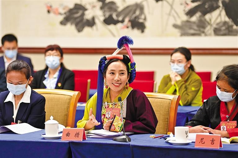连日来,党的二十大西藏代表团认真学习讨论党的二十大报告、中央纪委工作报告和党章修正案。图为曲措代表(中)在发言。旦增西旦摄(中经视觉)