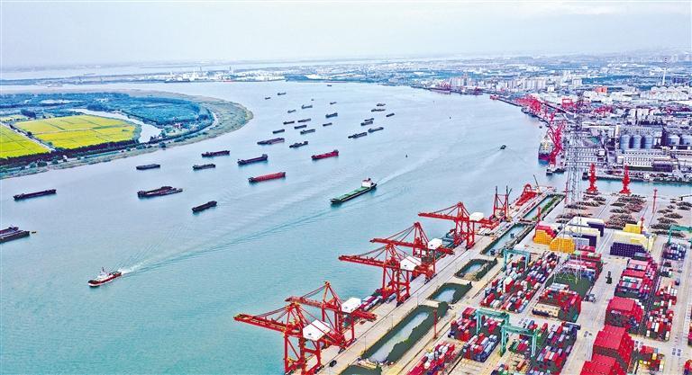 10月21日,江苏省张家港长江水域江面上船只往来穿梭,一艘艘满载物资的货轮在航道上有序航行。连日来,企业开足马力赶订单,工人争分夺秒忙生产,助推了长江运输业发展,有着“黄金水道”之称的长江航线进入繁忙运输季节。施柏荣摄(中经视觉)