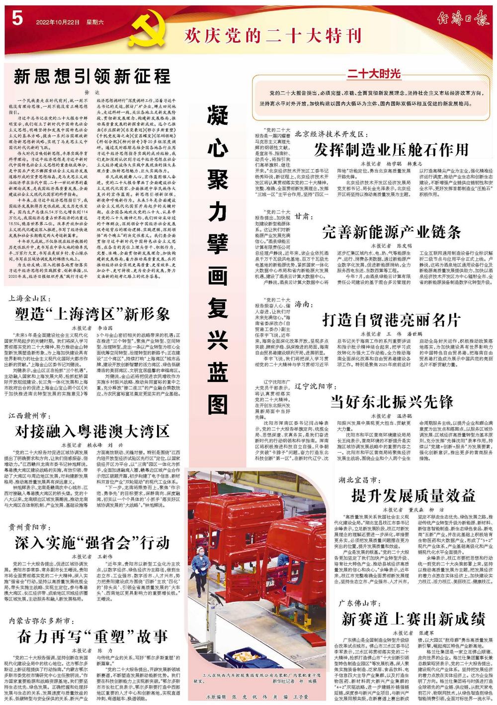“未来5年是全面建设社会主义现代化国家开局起步的关键时期。我们将深入学习贯彻落实党的二十大精神,努力推动金山转型新发展塑造新形象,为上海加快建设具有世界影响力的社会主义现代化国际大都市作出新的贡献。”上海金山区委书记刘健说。