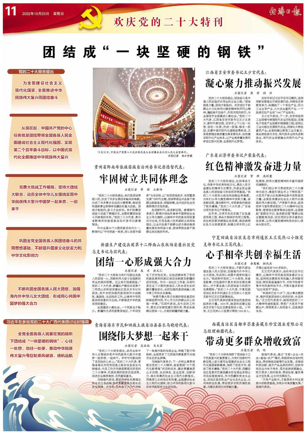 党的二十大报告提出,不断巩固全国各族人民大团结,加强海内外中华儿女大团结,形成同心共圆中国梦的强大合力。“现场聆听党的二十大报告,我备受鼓舞,对祖国和宁夏未来的发展充满信心,对宁夏各族人民团结奋斗的明天充满期盼。”党的二十大代表、宁夏回族自治区吴忠市利通区王兰花热心小组党支部书记王兰花感慨地说。