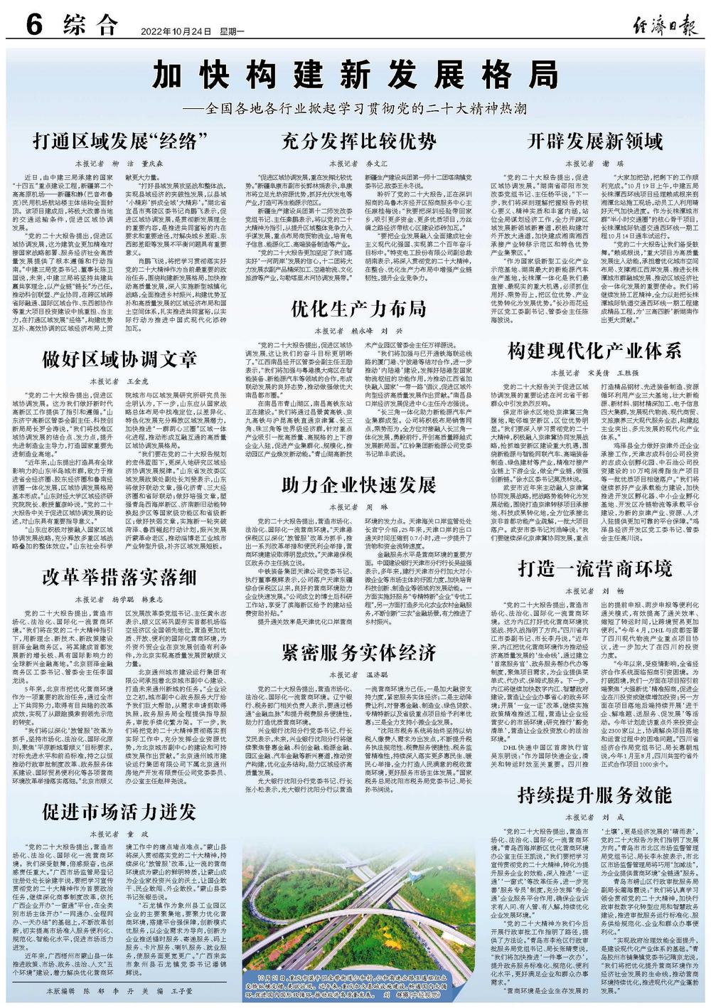 “党的二十大报告提出,促进区域协调发展。”湖南省邵阳市发改委党组书记、主任杨平说,“下一步,我们将深刻理解把握报告的核心要义、精神实质和丰富内涵,站位全局谋划经济工作,全力开辟区域发展新领域新赛道,积极构建对外开放大通道,加快建成湘南湘西承接产业转移示范区和特色优势产业集聚区。”