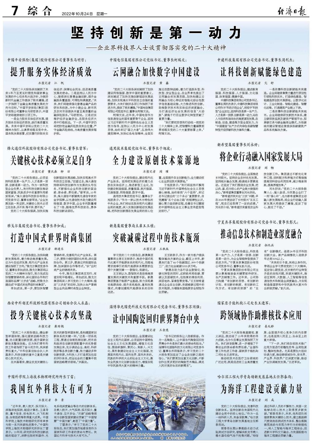 “党的二十大报告提出,必须坚持科技是第一生产力、人才是第一资源、创新是第一动力。作为一家科技型企业负责人,我对科技创新在推动国家富强、民族进步中的重要作用感受很深。”烽火通信科技股份有限公司党委书记、董事长曾军说,“企业发展实践一再证明,关键核心技术必须立足自身,买不来、等不来、要不来。”