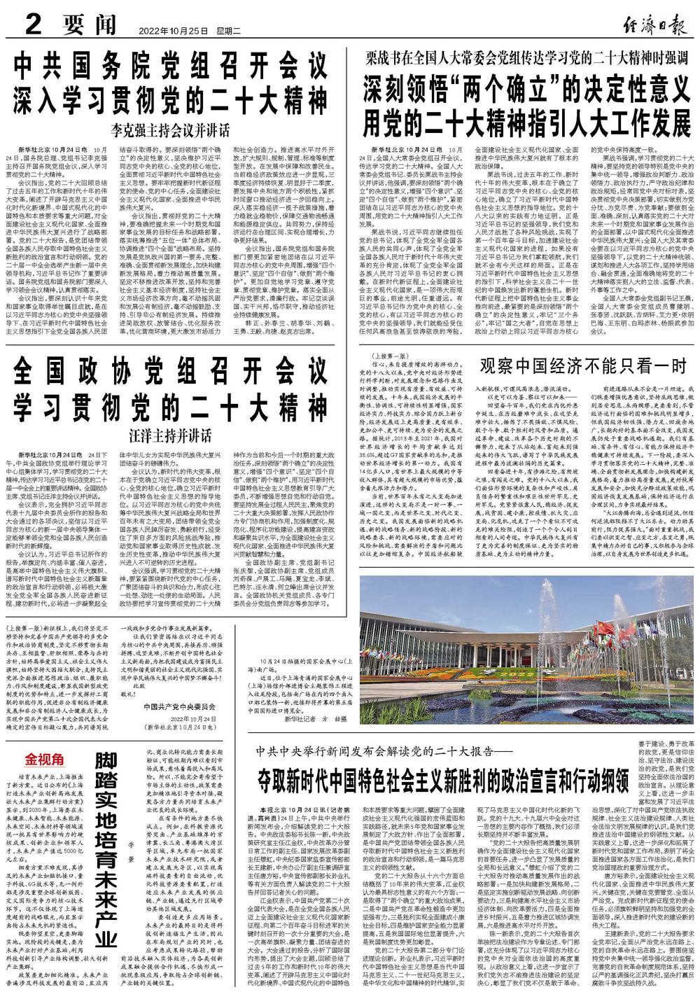 栗战书强调,学习贯彻党的二十大精神,要坚持党的领导特别是党中央的集中统一领导,增强政治判断力、政治领悟力、政治执行力,严守政治纪律和政治规矩,经常同党中央对标对表,坚决贯彻党中央决策部署,切实做到为党分忧、为党尽责、为党奉献;要做到全面、准确、深刻,认真落实党的二十大对未来一个时期党和国家事业发展作出的全面部署,以中国式现代化全面推进中华民族伟大复兴;全国人大及其常委会要在以习近平同志为核心的党中央坚强领导下,以党的二十大精神统领、谋划和推进人大各项工作,坚持学用结合、融会贯通,全面准确地将党的二十大精神落实到人大的立法、监督、代表、外事等工作之中。