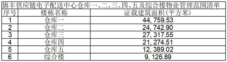 我分公司拟对旗丰供应链电子配送中心仓库一、二、三、四、五及综合楼(以下简称“本项目”)的物业管理进行招商,位于深圳市龙岗区南湾街道下李朗社区白李路26号。本项目证载土地面积5.96万平方米,建筑面积13.96万平方米,共6栋建筑。