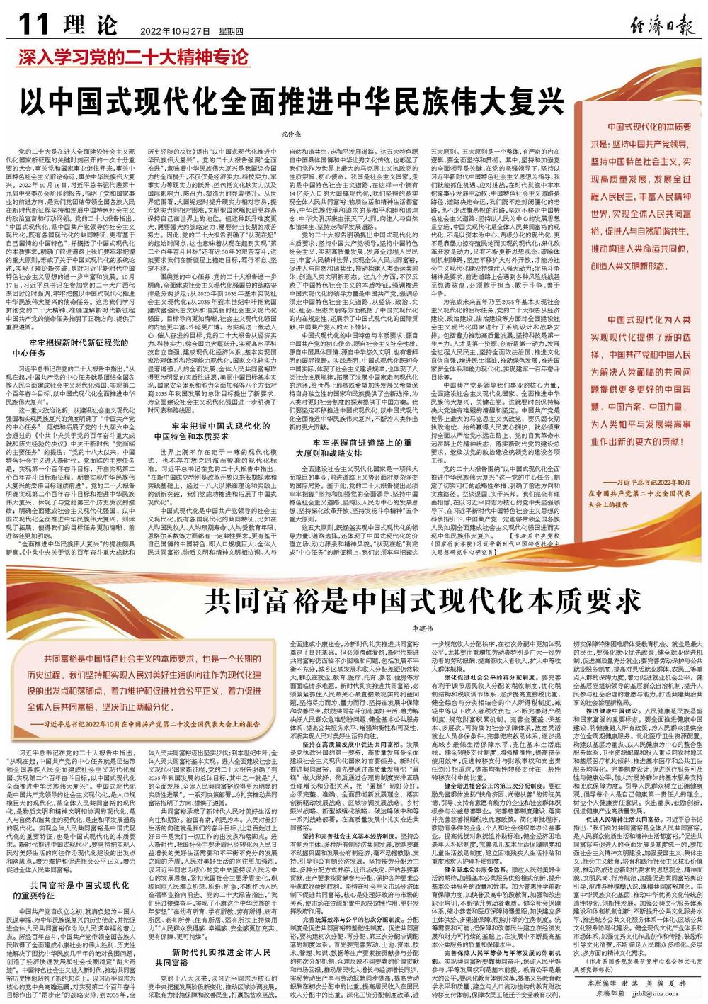 党的二十大是在进入全面建设社会主义现代化国家新征程的关键时刻召开的一次十分重要的大会,事关党和国家事业继往开来,事关中国特色社会主义前途命运,事关中华民族伟大复兴。2022年10月16日,习近平总书记代表第十九届中央委员会所作的报告,指明了党和国家事业的前进方向,是我们党团结带领全国各族人民在新时代新征程坚持和发展中国特色社会主义的政治宣言和行动纲领。党的二十大报告指出,“中国式现代化,是中国共产党领导的社会主义现代化,既有各国现代化的共同特征,更有基于自己国情的中国特色”,并概括了中国式现代化的本质要求,明确了前进道路上我们要牢牢把握的重大原则,形成了关于中国式现代化的系统论述,实现了理论新突破,是对习近平新时代中国特色社会主义思想的进一步丰富和发展。10月17日,习近平总书记在参加党的二十大广西代表团讨论时强调,牢牢把握以中国式现代化推进中华民族伟大复兴的使命任务。这为我们学习贯彻党的二十大精神、准确理解新时代新征程中国共产党的使命任务指明了正确方向、提供了重要遵循。