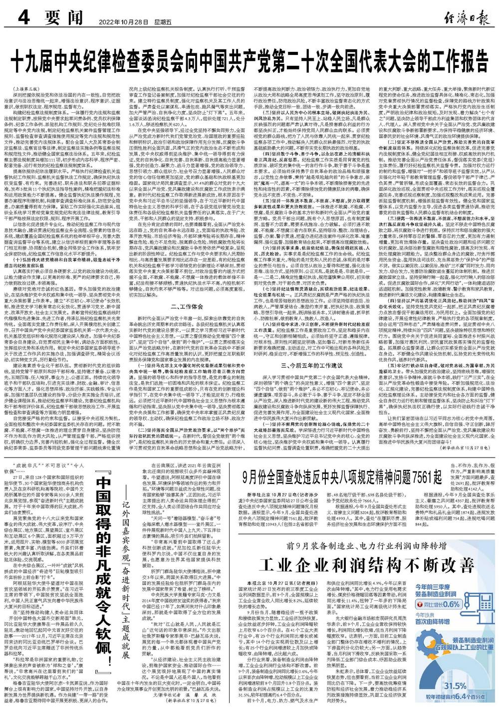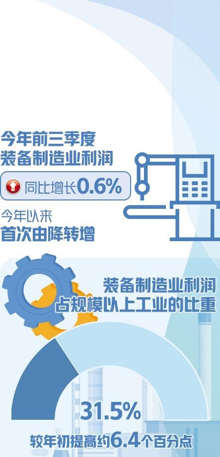分行业来看,装备制造业利润由降转增,工业企业利润行业结构不断改善。前9个月,装备制造业利润同比增长0.6%,今年以来首次由降转增,拉动规模以上工业企业利润增速较前8个月回升0.8个百分点。装备制造业利润占规模以上工业的比重为31.5%,较年初提高约6.4个百分点。