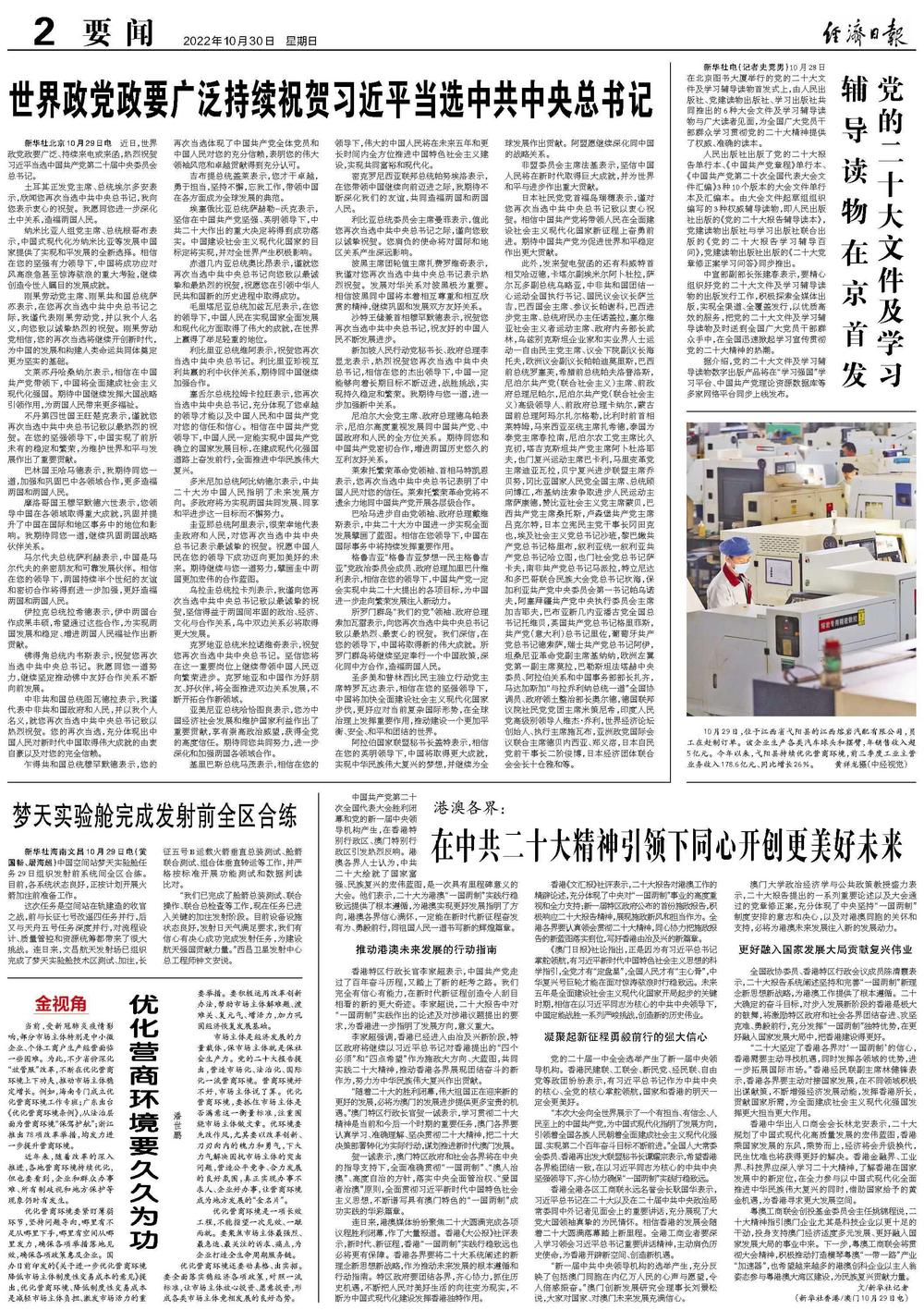连日来,港澳媒体纷纷聚焦二十大圆满完成各项议程胜利闭幕,作了大量报道。香港《大公报》社评表示,新时代、新征程,香港“一国两制”实践行稳致远也必将更有保障。香港各界要将二十大系统阐述的新理念新思想新战略,作为推动未来发展的根本遵循和行动指南。特区政府要团结各界,齐心协力,抓住历史机遇,不断把人民对美好生活的向往变为现实,不断为中国式现代化建设发挥香港独特作用。